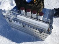 - Kép: A fúrással felszínre hozott jégmagot a helyszínen felszeletelik, edényekbe zárják és gondosan elcsomagolják.