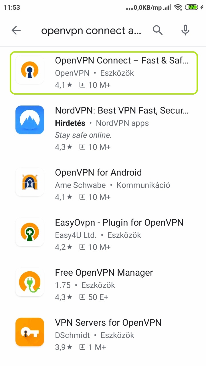 - A Google Play Áruházban az OpenVPN Connect App telepítése, beállítása: